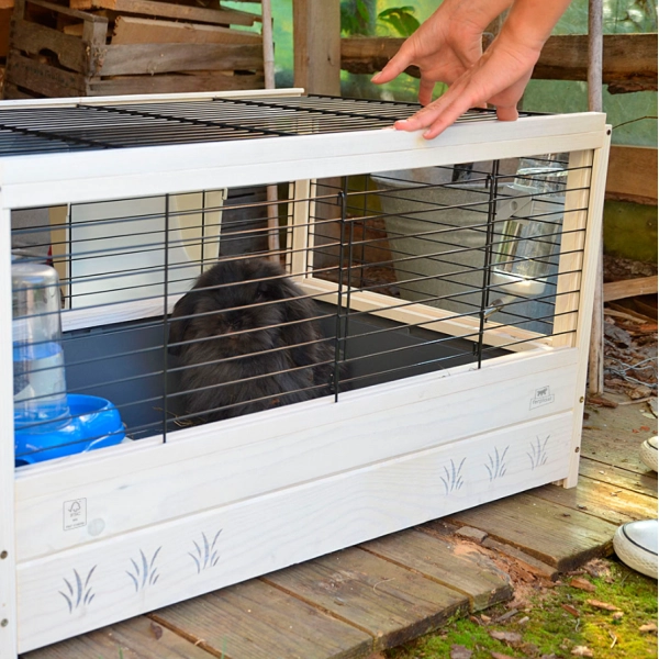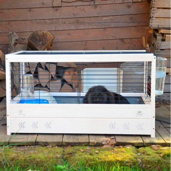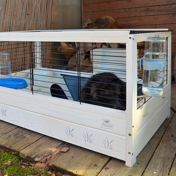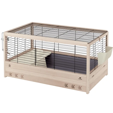 Kolekcia drevených domčekov a klietok od značky Ferplast je nielen krásna, ale aj ekologická. Na výrobu je využité drevo iba z obnoviteľných zdrojov, výrobou teda nie je prírode ubližované. A to je dôležitý fakt pre každého chovateľa. Arena 100 predstavuje krásne a priestranné bývanie pre stredne veľké hlodavce alebo menšie králiky. Hlavnou prednosťou je vnútorná plastová vanička, ktorá spoľahlivo ochráni drevené prvky pred okusovaním, namočením a znečistením od krmiva. Túto vaničku môžete pár jednoduchými pohybmi oddeliť od drevenej klietky a tak ju pohodlne vyčistiť. Súčasťou klietky je aj potrebné vybavenie. Hornú časť klietky tvorí drevená konštrukcia s kovovým pletivom. Vrchné vodorovné pletivo sa po uvoľnení západiek nechá rukou ľahko odsunúť a tým sa dostanete do klietky. Malé posuvné dvierka spredu poslúžia na pohladenie vášho maznáčika či naplnenie misky.