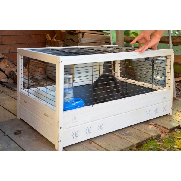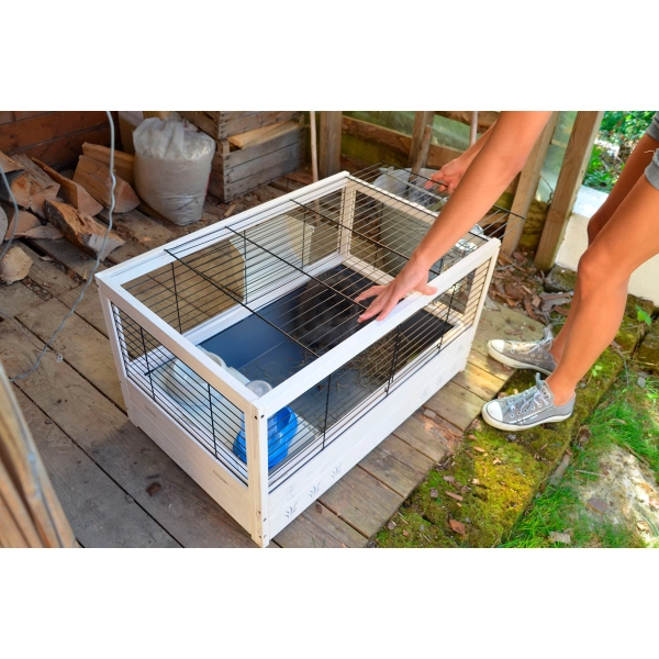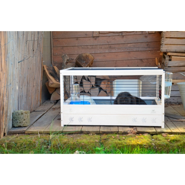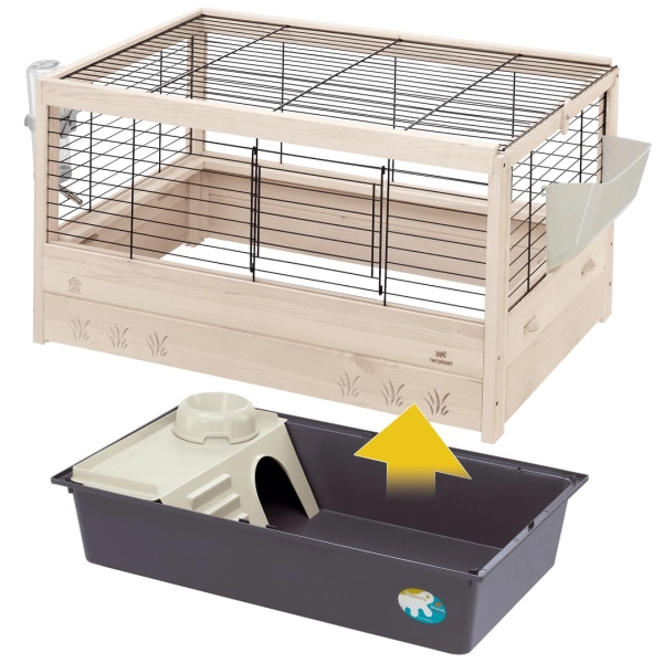 Kolekcia drevených domčekov a klietok od značky Ferplast je nielen krásna, ale aj ekologická. Na výrobu je využité drevo iba z obnoviteľných zdrojov, výrobou teda nie je prírode ubližované. A to je dôležitý fakt pre každého chovateľa. Arena 80 predstavuje krásne a priestranné bývanie pre stredne veľké hlodavce. Hlavnou prednosťou je vnútorná plastová vanička, ktorá spoľahlivo ochráni drevené prvky pred okusovaním, namočením a znečistením od krmiva. Túto vaničku môžete pár jednoduchými pohybmi oddeliť od drevenej klietky a tak ju pohodlne vyčistiť. Súčasťou klietky je aj potrebné vybavenie. Hornú časť klietky tvorí drevená konštrukcia s kovovým pletivom. Vrchné vodorovné pletivo sa po uvoľnení západiek nechá rukou ľahko odsunúť a tým sa dostanete do klietky. Malé posuvné dvierka spredu poslúžia na pohladenie vášho maznáčika či naplnenie misky.