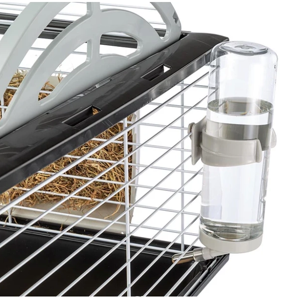 Súčasťou balenia je príslušenstvo do klietky: napájačka, zásobník na seno, miska a domček.