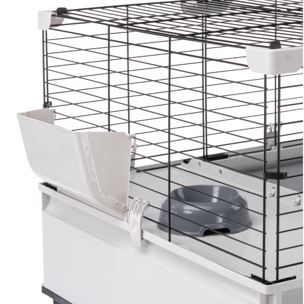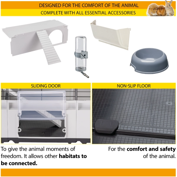 Súčasťou balenia je príslušenstvo do klietky: napájačka na vodu, miska na krmivo, domček, rebrík, zásobník na seno.