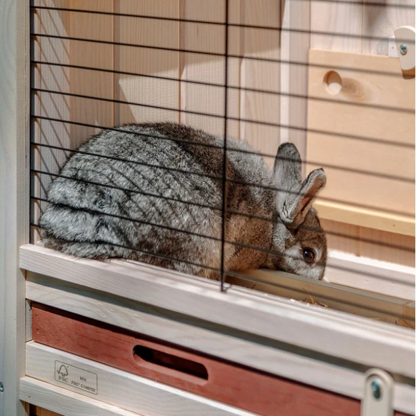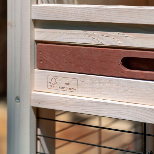 Drevená klietka pre králiky Ferplast Ranch 100 Basic vyniká kvalitným spracovaním s krásnym dizajnom, použitím udržateľných materiálov a mnohých ďalších zaujímavých prvkov, ktoré uľahčia upratovanie a spolužitie s vaším malým chlpáčikom. Klietka je vyrobená z certifikovaného dreva severskej borovice, ktorej lesy sú zodpovedne obhospodarované podľa prísnych noriem. Drevo je ošetrené ekologicky nezávadným a netoxickým lakom proti plesniam, ktorý je odolný voči UV žiareniu a odpudzuje vodu. Dvojposchodová klietka umožní králičkovi pohodlne cestovať medzi jednotlivými poschodiami podľa jeho potreby. Po výdatnom občerstvení na dolnom poschodí môže nerušene odpočívať v domčeku na hornom poschodí.