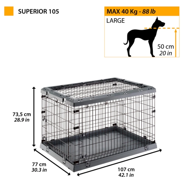 Klietka pre psy Ferplast Superior Nero môže slúžiť pri výcviku šteniat, ktoré by inak potrebovali neustály dohľad. Je to tiež skvelý nástroj, ak je váš pes bojazlivý alebo potrebuje pokoj a vlastný priestor. Klietka poslúži psovi aj na cestách, keď je pes bezpečne prepravovaný a má svoj osobný kútik v novom prostredí, ktoré dôverne pozná. Kovová konštrukcia sa dá ľahko zložiť do skladnej veľkosti a vďaka plastovým rámom sa opäť ľahko rozkladá. Dvere klietky sú vystužené a vybavené dvojitým bezpečnostným zámkom. Klietka má 3 praktické otvory pre väčšiu flexibilitu použitia, vrchná časť je úplne odnímateľná.
