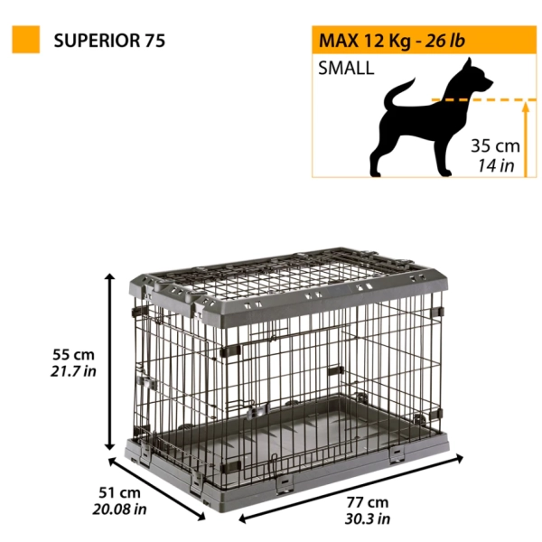 Klietka pre psy Ferplast Superior Nero môže slúžiť pri výcviku šteniat, ktoré by inak potrebovali neustály dohľad. Je to tiež skvelý nástroj, ak je váš pes bojazlivý alebo potrebuje pokoj a vlastný priestor. Klietka poslúži psovi aj na cestách, keď je pes bezpečne prepravovaný a má svoj osobný kútik v novom prostredí, ktoré dôverne pozná. Kovová konštrukcia sa dá ľahko zložiť do skladnej veľkosti a vďaka plastovým rámom sa opäť ľahko rozkladá. Dvere klietky sú vystužené a vybavené dvojitým bezpečnostným zámkom. Klietka má 3 praktické otvory pre väčšiu flexibilitu použitia, vrchná časť je úplne odnímateľná.
