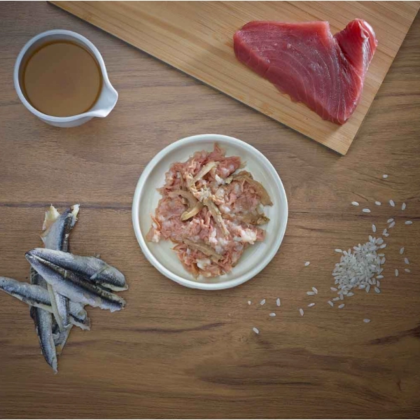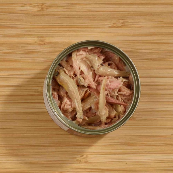 Makrela 65 %, rybí vývar 26 %, sardely 5 %, ryža 4 %.