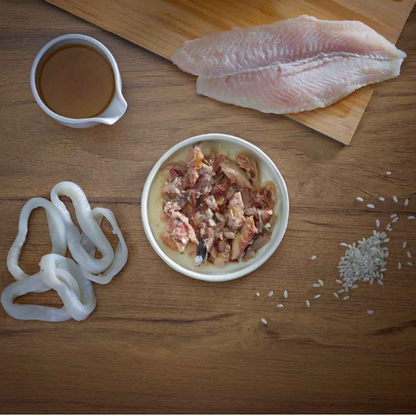 Makrela 65 %, rybí vývar 26 %, kalamáre 5 %, ryža 4 %.
