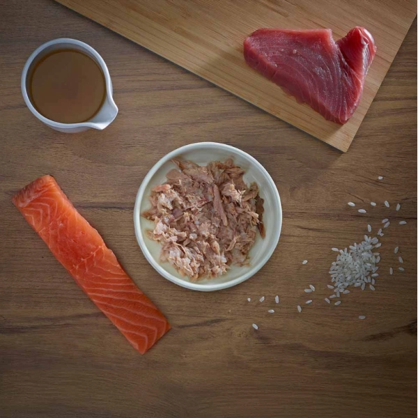 Tuniak 54 %, rybí vývar 38 %, losos 4 %, ryža 4 %.