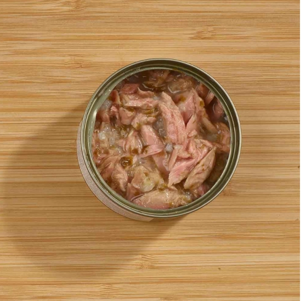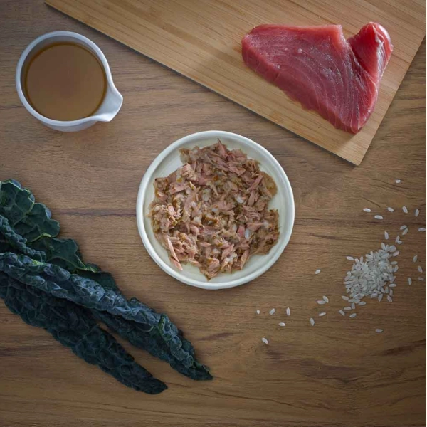 Tuniak 57 %, rybí vývar 38,5 %, ryža 4 %, morské riasy 0,5 %.
