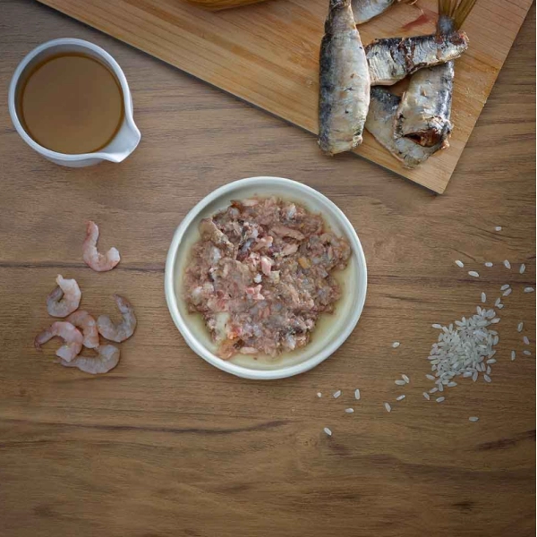 Sardinky 65 %, rybí vývar 26 %, krevety 5 %, ryža 4 %.