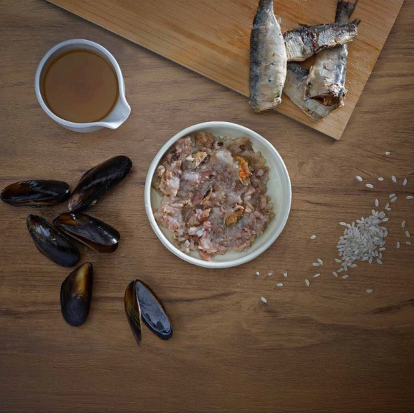Sardinky 65 %, rybí vývar 26 %, mušle 5 %, ryža 4 %.