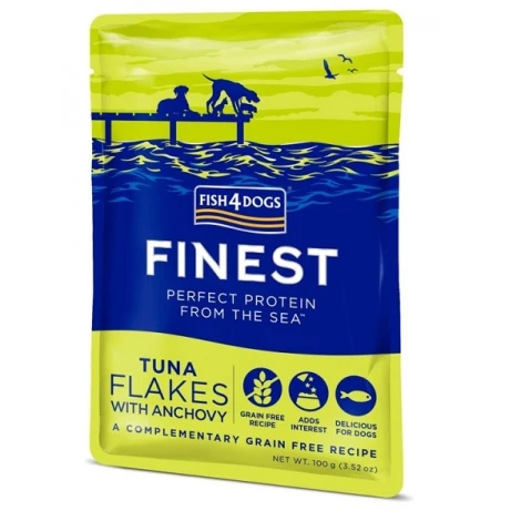 Chutná kapsička pre psov Fish4Dogs Finest s kúskami tuniaka a ančovičkami. Toto doplnkové krmivo možno pridať k suchému krmivu alebo podávať samostatne. Kapsička je bez obilnín, bez pridaných umelých konzervačných látok a farbív. Túto prírodnú kapsičku si zamiluje každý milovník rýb!
