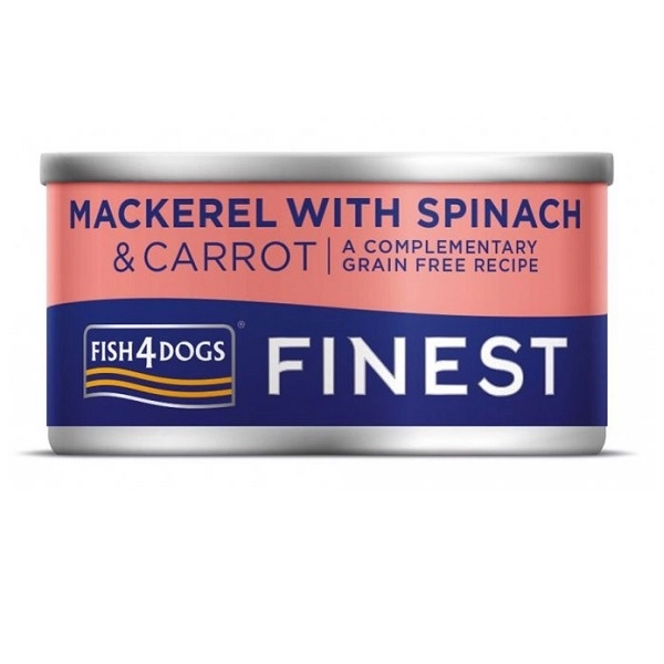 Chutná konzerva Fish4Dogs Finest pre psích milovníkov rýb. Receptúra s makrelou, mrkvou a špenátom je pripravená z kvalitných rýb a zeleniny. Neobsahuje obilniny, pridané umelé farbivá a príchute.