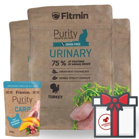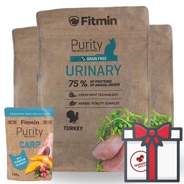 Kompletný Grain-free krmivo Fitmin Cat Purity Urinary pre mačky pre podporu funkcie močového systému. Znižuje záťaž na obličky, obsahuje optimálne množstvo bielkovín. Základom je nízkotučné kuracie a morčacie mäso.