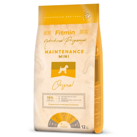 Fitmin Mini Maintenance je kompletné krmivo pre dospelých psov malých plemien so stredným obsahom energie. Jeho zloženie obsahuje dentálny komplex pre zdravé zuby a rozmarínový extrakt na podporu funkcie pečene a lepšie trávenie. Aby sa znížilo riziko alergických reakcií, krmivo neobsahuje pšenicu a lepok. Balené v ekologicky recyklovateľných obaloch.