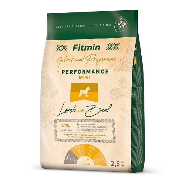 Fitmin Nutritional Programme je superprémiové krmivo obsahujúce vysoký podiel jahňacieho a hovädzieho mäsa v kombinácii s ryžou a hrachom. Krmivo je určené pre dospelých psov malých plemien s hmotnosťou do 15 kg, s vysokou záťažou, vo veku od 1 roka do 9 rokov.