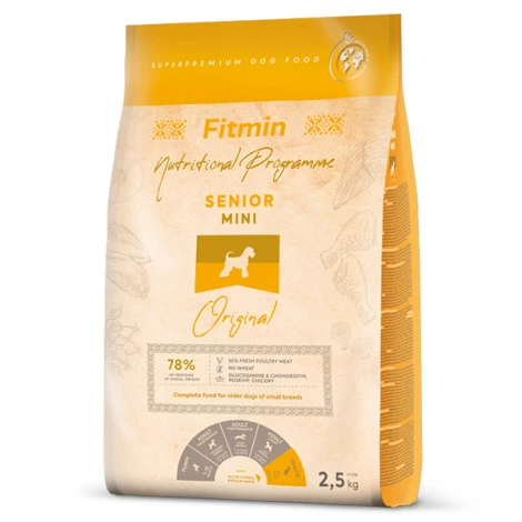 Fitmin Mini Senior je kompletné krmivo pre dospelých psov malých plemien starších ako 9 rokov. Receptúra obsahuje komplex antioxidantov proti príznakom starnutia, chondroitín siričitan a glukozamín pre zdravé kĺby, prebiotiká na podporu zdravej črevnej mikroflóry a šípky ako bohatý zdroj vitamínu C. Aby sa znížilo riziko alergických reakcií, krmivo neobsahuje pšenicu a lepok. Balené v ekologicky recyklovateľných obaloch.