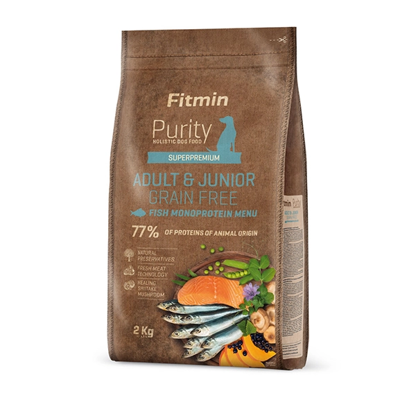 Kompletné jednobielkovinové krmivo bez obilnín Fitmin Dog Purity GF Adult & Junior Fish menu pre juniorov a dospelých psov stredných a veľkých plemien. Čerstvé suroviny, kvalita a vycibrená chuť krmiva zaujmú juniorov od 5 mesiacov a dospelých psích labužníkov.