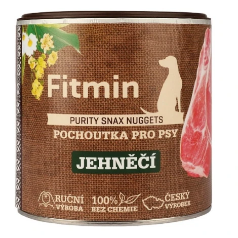 Hypoalergénna, prírodná a zdraviu prospešná maškrta Fitmin Dog Purity Snax Nuggets Lamb pre psy vo forme dukátikov. Vyrába sa ručne v Orlických horách, obsahuje 72 % čerstvého jahňacieho mäsa a extrudovanú ryžu. Pochúťka je úplne bez lepku, pridanej soli a chémie.
