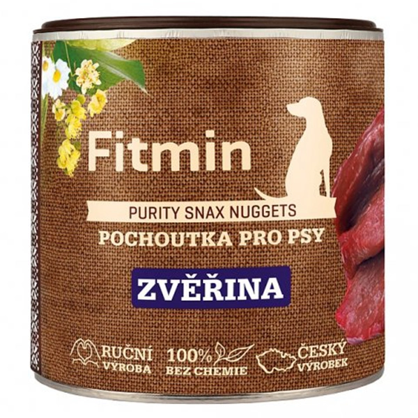 Hypoalergénna, prírodná, zdraviu prospešná maškrta Fitmin Dog Purity Snax Nuggets Wild pre psy vo forme dukátikov. Vyrába sa ručne v Orlických horách, obsahuje 79 % čerstvej zveriny a bravčového mäsa s prídavkom ryže. Pochúťka je úplne bez lepku, pridanej soli a chémie. Vhodné aj pre psíky s citlivým trávením. Jednoducho sa hryzú a neodolateľne voňajú.