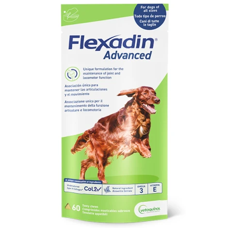 Kĺbová výživa Flexadin pre stredné a veľké psy vo forme veľmi chutných žuvaciach tabliet. Obsahuje UC II kolagén a výťažok liečivé rastliny Boswellia serrata, ktorá tlmí bolesť. Flexadin je určený pre podporu funkcie kĺbov postihnutých osteoartritídou.