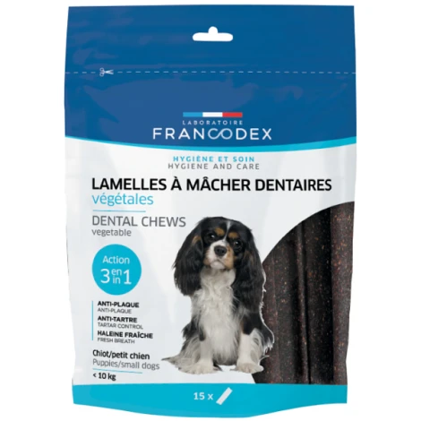 Francodex je výnimočná francúzska značka dentálnych produktov pre psov a mačky. Vyniká skvelými výsledkami v oblasti odstraňovanie zubného povlaku a tým zabráneniu vzniku zubného kameňa. Bonusom je výborný čistiaci efekt a osvieženie dychu. Plátky obsahujú dva enzýmy, ktoré majú zásadný vplyv na odstránenie a spätného usadenie zubného povlaku a bojujú tiež s baktériami medzi zubami a na jazyku. Ideálny doplnok dentálnej hygieny.