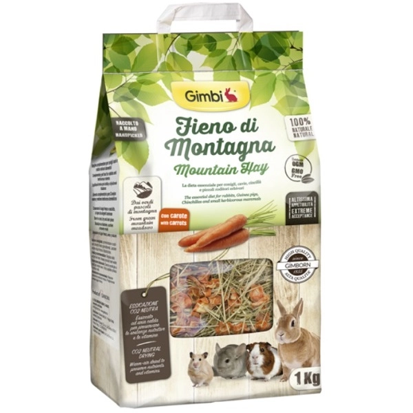 Prírodné horské seno Gimbi pre všetky bylinožravé hlodavce a králiky. Táto vynikajúca pochúťka nesmie chýbať v jedálničku žiadneho malého chlpáča. Navyše obsahuje prídavok mrkvy pre väčšiu chutnosť. Každodenné konzumácia sena napomáha k správnemu obrusovaniu zubov. V strave malých zvierat by malo byť seno podávané neobmedzene po celý deň.