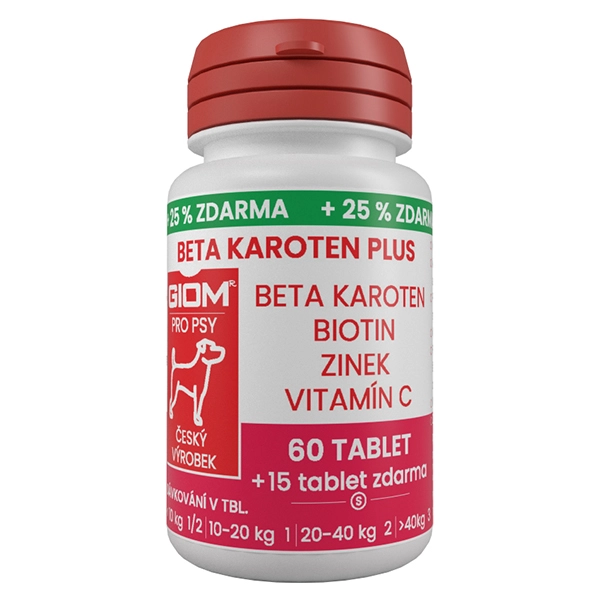 Doplnok stravy Giom Beta-karotén plus na podporu imunitného systému. Zlepšuje pigmentáciu a má veľmi dobrý vplyv na kvalitu srsti a kože. Vysoký obsah betakaroténu a vitamínu C.