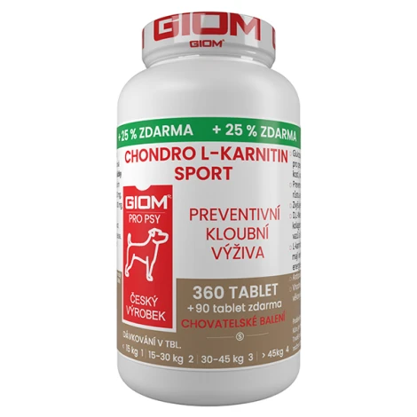 Kĺbová a svalová výživa Giom Chondro L-carnitine šport je vhodná na prevenciu kĺbových problémov v období rastu a najmä počas športových aktivít. Český výrobok bez farbív a konzervačných látok. Je vhodný pre psy a mačky všetkých vekových kategórií.