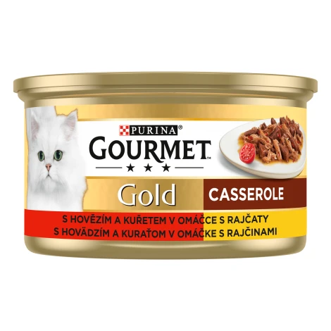 Extra chutná konzerva Gourmet Gold s kúskami duseného a grilovaného mäsa. Kombinácia hovädzieho a kuracieho mäsa je veľmi výdatná a chuťovo atraktívne.