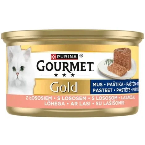 Extra chutná konzerva pre mačky Gourmet Gold. Jemná paštéta z tých najjemnejších kúskov lososa pohladí chuťové poháriky aj tých najmaškrtnejších mačiek. Kompletné krmivo bez pridaných farbív a umelých konzervačných látok.