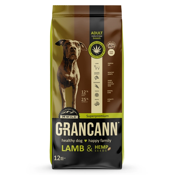 Mäso a produkty živočíšneho pôvodu (kvalitné jahňacie dehydratované mäso min. 17 %, odtučnené hovädzie mäso (lisované zastudena, dehydrované) 16 %, hydinová pečeň, hydinový tuk, lososový extrakt 2,5 %), výrobky rastlinného pôvodu (biela ryža, konopný granulát 12 %), vedľajšie výrobky rastlinného pôvodu (cukrovarské odrezky, pšeničné klíčky), oleje (zastudena lisovaný konopný olej 2,5 %), yucca 0,01 %, rozmarín 0,01 %, prídavky na zlepšenie pohybového aparátu (chondroprotektíva, probiotické látky, minerálne látky a vitamíny, ovocie (granátové jablko, brusnice, černice 0,01 %).