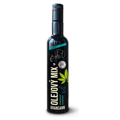 Grancann Adult olejový mix je kombinácia za studena lisovaného konopného a lososového oleja určená pre dospelé mačky a psy všetkých plemien. Olej komplexne podporuje imunitu, potláča protizápalové procesy a spomaľuje proces starnutia.