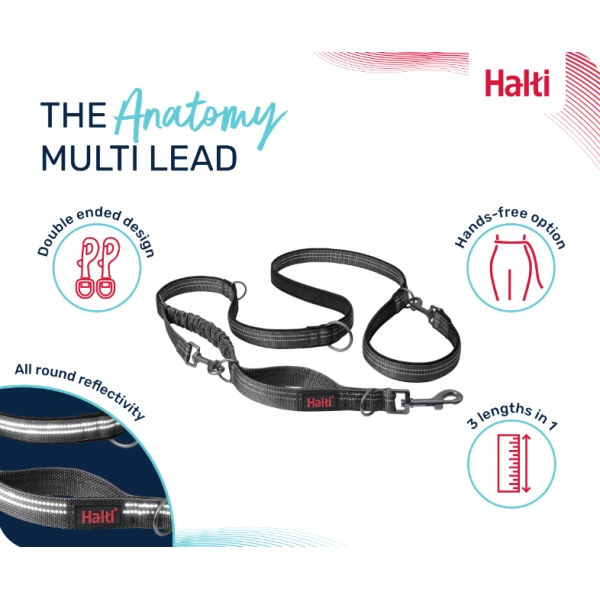 Vodítko Halti Anatomy Multi je ľahké a všestranné prepínateľné vodítko pre psov s hmotnosťou do 55 kg. Vodítko Halti poskytuje maximálnu flexibilitu a dokáže sa dokonale prispôsobiť akémukoľvek typu prechádzky - od pokojných ranných prechádzok až po náročné túry. Možno ho používať s tlmičom nárazov alebo bez neho a nastavenia sa dajú rýchlo upraviť prepnutím vyhradenej karabíny.