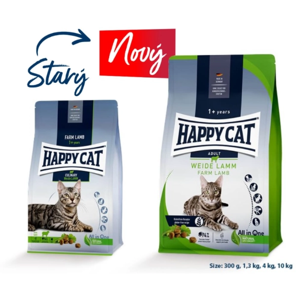 Kompletné krmivo Happy Cat Culinary Weide-Lamm pre dospelé mačky od 12. mesiacov veku. Receptúra s ľahko stráviteľným jahňacím mäsom je vhodná pre mačky s citlivejším zažívaním.