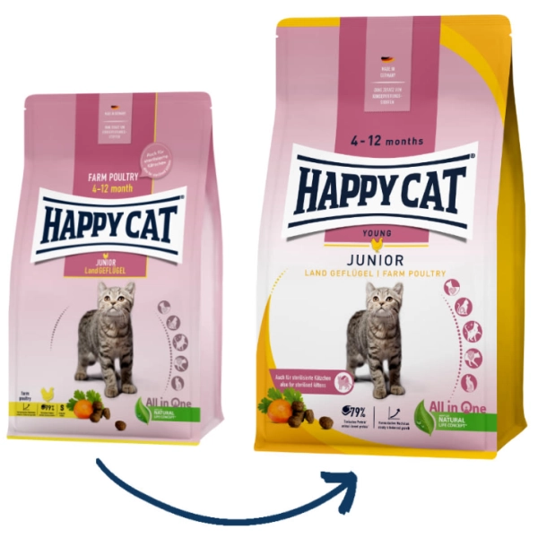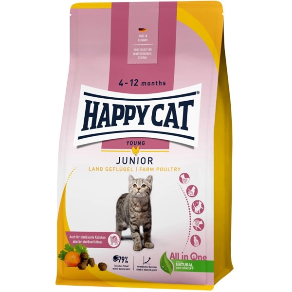 Kompletné krmivo Happy Cat Junior Land Geflügel pre podporu harmonického rastu mladých mačiek od 4. do 12. mesiaca veku. Ľahko stráviteľná receptúra s hydinou obsahuje extra malé granulky.
