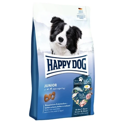 Kompletné krmivo Happy Dog Fit & Vital Junior pre optimálny vývoj mladých psov od 7 do 18 mesiacov. Zloženie bez pšenice podporuje zdravý vývoj kĺbov a kostí.