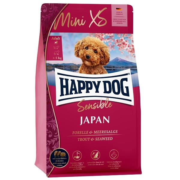 Happy Dog Sensible Mini XS Japan je kompletné krmivo pre dospelé psy malých a veľmi malých plemien. Bezlepková a ľahko stráviteľná receptúra s ľanovým semienkom a jablčnou vlákninou je obzvlášť šetrná pre žalúdok a črevá. Jedinečná receptúra zo pstruha, kurčaťa a morských rias je chuťovým zážitkom najmä pre malé psy. Omega-3 a omega-6 mastné kyseliny a morské riasy podporujú lesklú srsť a prirodzenú kožnú bariéru a vďaka prídavku juka chidigera pomáha znižovať zápach trusu. Extra malé granulky sú optimálne prispôsobené malým zúbkom veľmi malých psov do 5 kg dospelej hmotnosti.