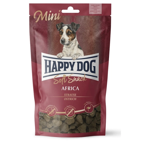 Happy Dog Soft Africa Snack sú malé mäkké pochúťky pre malé psy. Obsahujú pštrosie mäso a sú schválené pre psy s potravinovými alergiami a citlivým trávením. Extra chutné pochúťky pre chlpáčov.