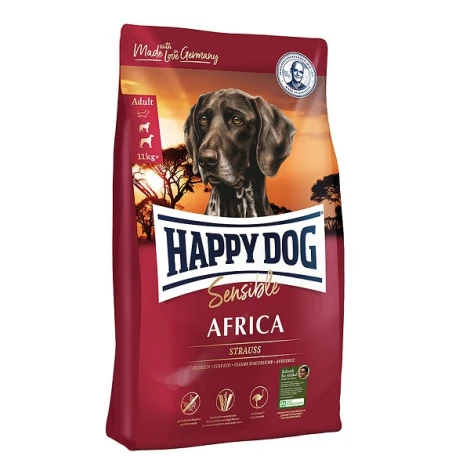 Gurmánsky bezobilný zážitok sa pštrosím mäsom. To je Happy Dog Africa. Lahodné krmivo pre dospelých psov všetkých plemien, vhodné aj pre jedincov s citlivým trávením.
