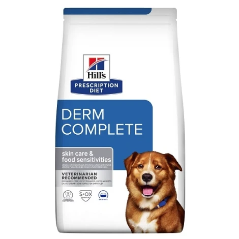 Hill's PD Canine Derm Complete pomáha psom zvládnuť problémy spojené s alergiou na krmivo alebo prostredie. Je to kompletné suché krmivo pre psov, ktorí v dôsledku alergie vykazujú svrbenie, suchú kožu alebo sa škriabu. Receptúra obsahuje všetku výživu potrebnú pre psa. Špeciálne zloženie posilňuje kožnú bariéru a zabraňuje prenikaniu dráždivých látok z okolia.