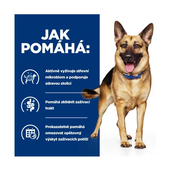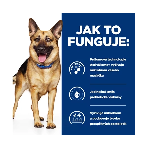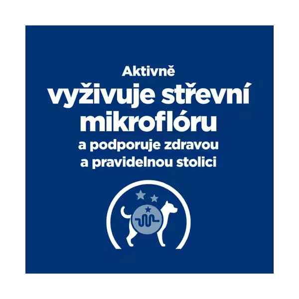 Hill's PD Canine GI Biome je kompletné dietetické krmivo vhodné na zmiernenie porúch vstrebávania živín v črevách a na kompenzáciu zlého trávenia u dospelých psov. Obmedzuje črevné resorpčné ochorenie a kompenzuje maldigesciu. Toto krmivo s doplnkom vlákniny má zvýšenú hladinu sodíka a draslíka a vysoko stráviteľné ingrediencie. S vysokým obsahom vlákniny, u ktorého je klinicky overené, že pomáha upraviť riedku stolicu počas 24 hodín a znižuje riziko recidívy. Vyrobené s technológiou ingrediencií ActivBiome+, ktorá rýchlo aktivuje črevný mikróbiom a pomáha zvládať gastrointestinálne problémy.