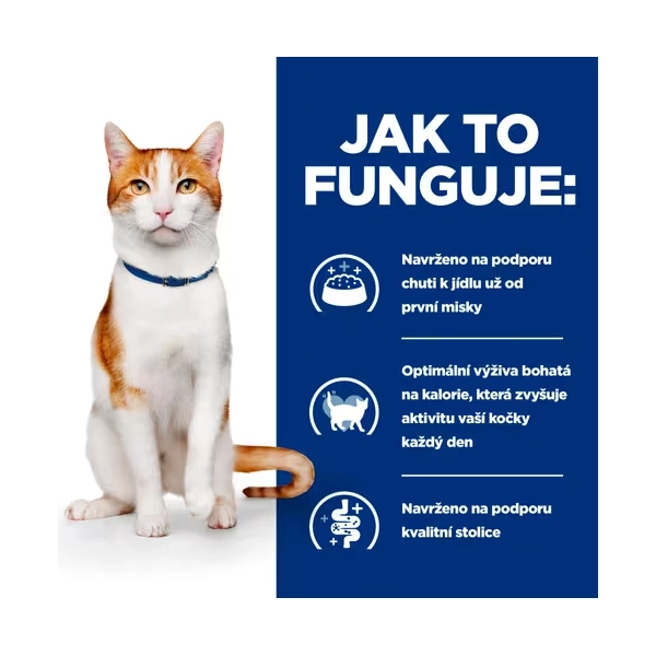 - optimálna výživa bohatá na kalórie na podporu každodenných aktivít mačky