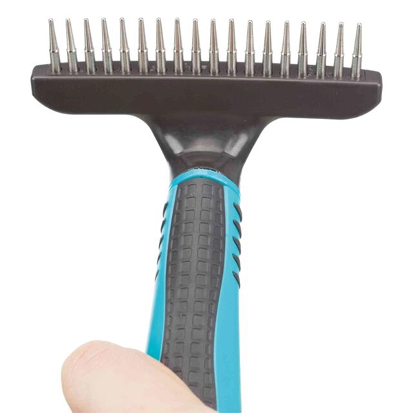Hrablo s rotačnými zubami a protišmykovou gumovou rukoväťou. Ľahko rozčeše aj silnejšie zacuchanú srsť.