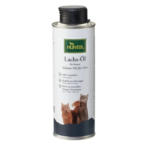 Čistý lososový olej je skvelým doplnkom stravy pre mačky. Je bohatý na Omega-3 mastné kyseliny a antioxidanty, ktoré prinášajú množstvo zdravotných výhod. Podporuje krásnu a zdravú srsť a pokožku a taktiež podporuje imunitný a tráviaci systém. Na uchovanie svojich skvelých vlastností je lososový olej Hunter plnený do kovovej recyklovateľnej fľaše, ktorá ho chráni pred svetlom a zmenami teploty.