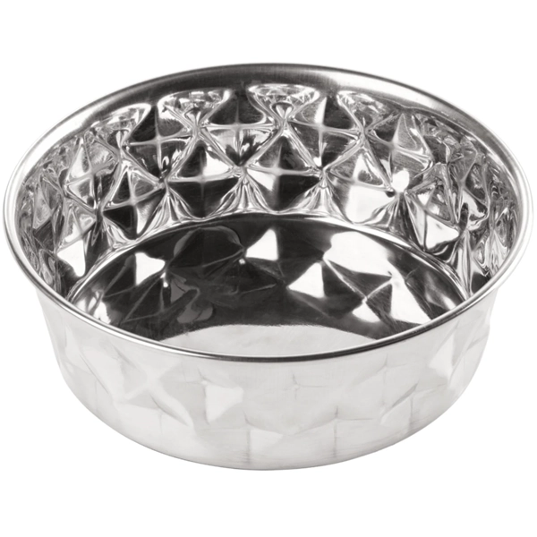 Krásna miska Hunter Namy II z nehrdzavejúcej ocele s pyramídovým vzorom. Miska pre psov je vyrobená z kvalitnej nemeckej nehrdzavejúcej ocele. Spodná strana je potiahnutá silikónom, vďaka ktorému sa miska nešmýka po podlahe. Možno umývať v umývačke riadu.