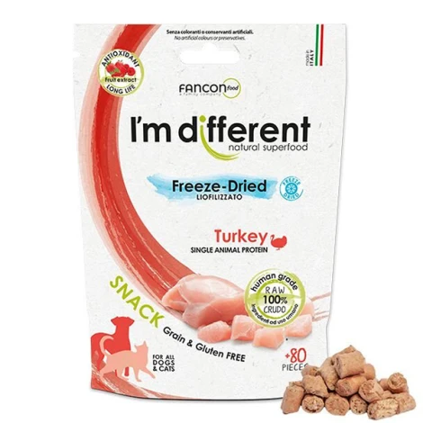 I'm Different Snack je monoproteínová pochúťka s morkou, ktorá si vďaka pomalému procesu sušenia mrazom zachováva všetky výživové hodnoty, nutričnú hodnotu a čerstvosť "RAW" surovín. Prísady sú tak zdravšie, chutnejšie a stráviteľnejšie.