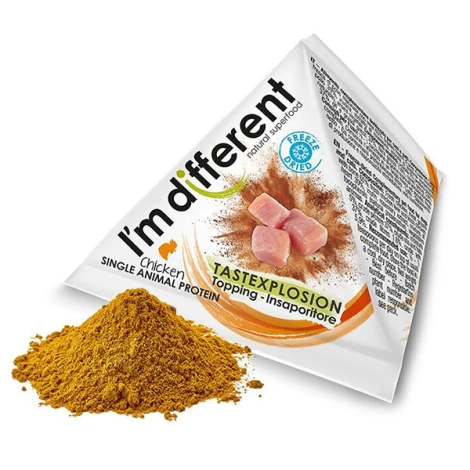 Mäsový prášok I'm different Topper s kurčaťom robí z bežnej stravy niečo neodolateľné aj pre tie najmaškrtnejšie jazýčky psov a mačiek. Tento jednobielkovinový mäsový doplnok je väčšinou jediným zdrojom živočíšnych bielkovín, takže je ideálny ako doplnok stravy pre psy a mačky, ktoré trpia nechutenstvom, nedostatočne prijímajú potravu alebo ak sú v rekonvalescencii.