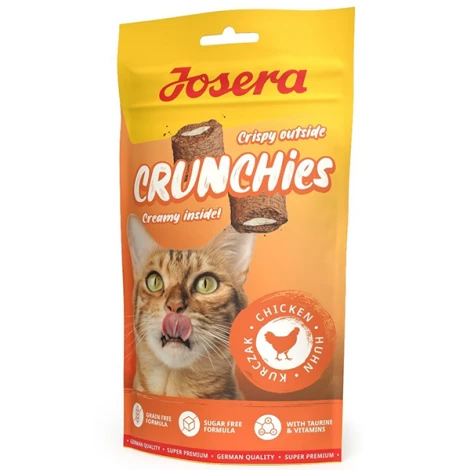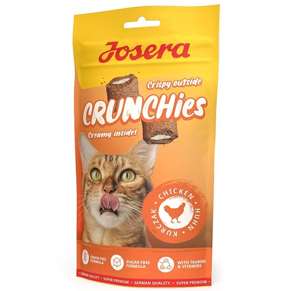 Josera Cat Crunchies Chicken sú chutné pochúťky s príchuťou hydiny pre dospelé mačky, ktoré kombinujú chrumkavú štruktúru s lahodnou krémovou náplňou. Vďaka obsahu cenných vitamínov a taurínu podporujú zdravie a vitalitu a zároveň pôsobia proti tvorbe trichobezoárov. Receptúra je úplne bez obilnín, pridaného cukru, sóje, mlieka, farbív a konzervačných látok, vďaka čomu je to zdravý snack pre vašu mačku. A vďaka nízkemu obsahu kalórií si ju váš chlpáčik môže bez výčitiek vychutnávať každý deň.