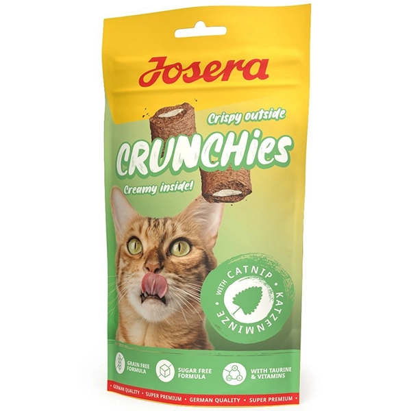Josera Cat Crunchies s catnipom sú chutné pochúťky s príchuťou mačacej mäty pre dospelé mačky, ktoré kombinujú chrumkavú štruktúru s lahodnou krémovou náplňou. Vďaka obsahu cenných vitamínov a taurínu podporujú zdravie a vitalitu a zároveň pôsobia proti tvorbe trichobezoárov. Receptúra je úplne bez obilnín, pridaného cukru, sóje, mlieka, farbív a konzervačných látok, vďaka čomu predstavuje zdravý a šetrný snack pre vašu mačku. Vďaka nízkemu obsahu kalórií si ich váš chlpáčik môže bez výčitiek vychutnávať každý deň.
