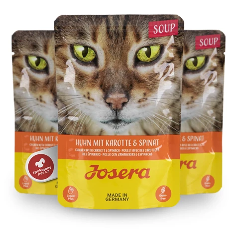 Doplnkové krmivo pre mačky vo forme polievky - Josera Cat Soup Chicken with Carrots & Spinach. Vhodné na poliatie suchých granúl alebo pre mačky, ktoré nechcú prijímať tekutiny vo forme vody. Polievka je úplne bez obilnín a obsahuje kura, mrkvu a špenát. Túto pochúťku si zamiluje aj ten najväčší mačacie labužník! Vyrobené v Nemecku.
