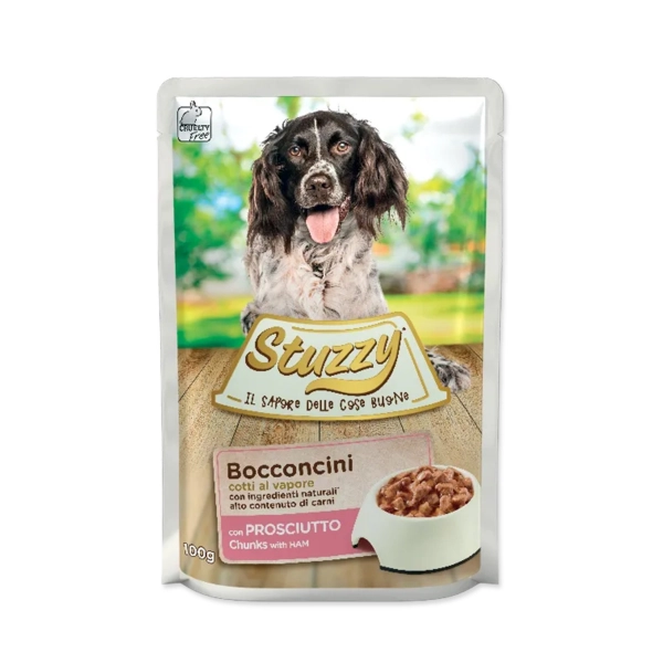 Lahodná kapsička Stuzzy pre psov. Bezchybná a ľahko prijímateľná strava s jemnou šunkou. Vyššia vlhkosť krmiva zaručuje tiež súčasný a dôležitý príjem vody.